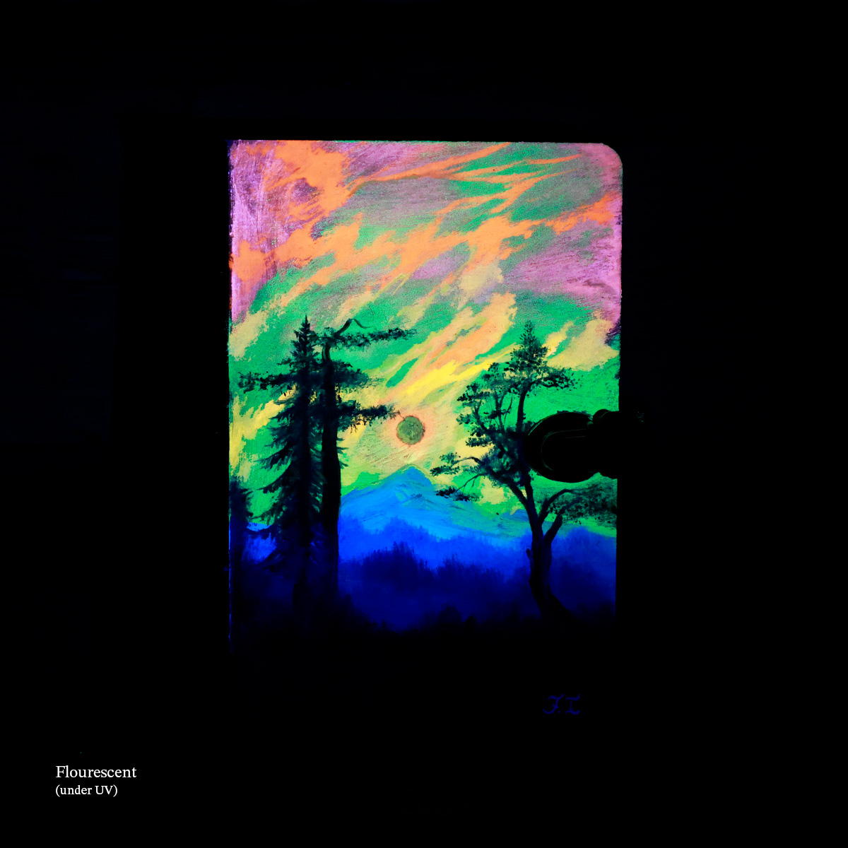 Please note that paintings created with fluorescent paint are less lightfast than those with traditional oil paints and may fade faster depending on exposure to sunlight and how they are kept. To enhance their longevity, all works are finished with a UV-protective varnish, but minimizing direct sunlight exposure is recommended.
