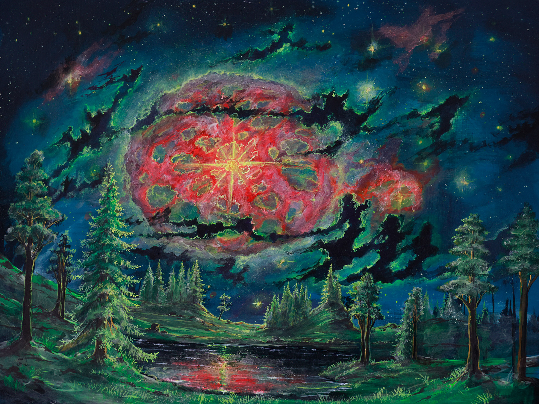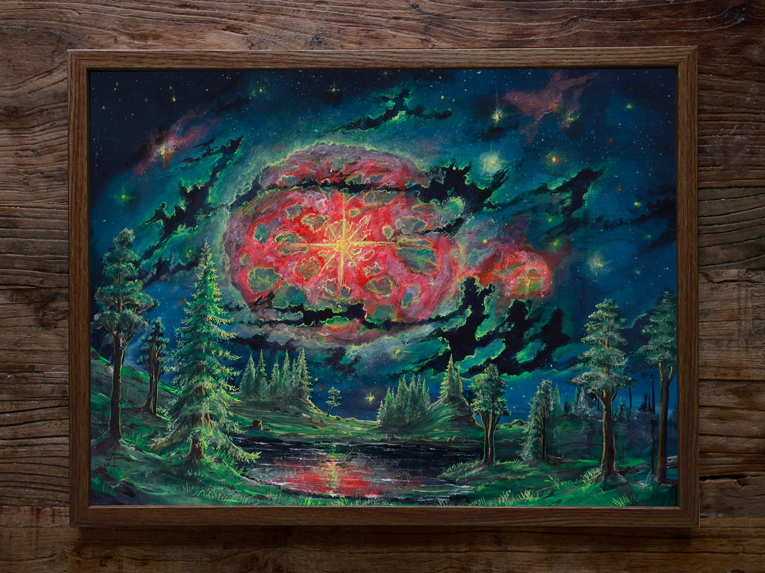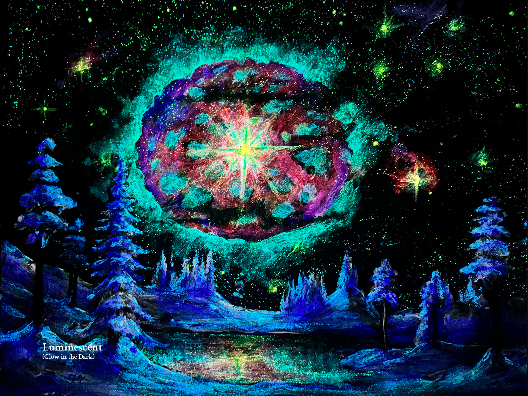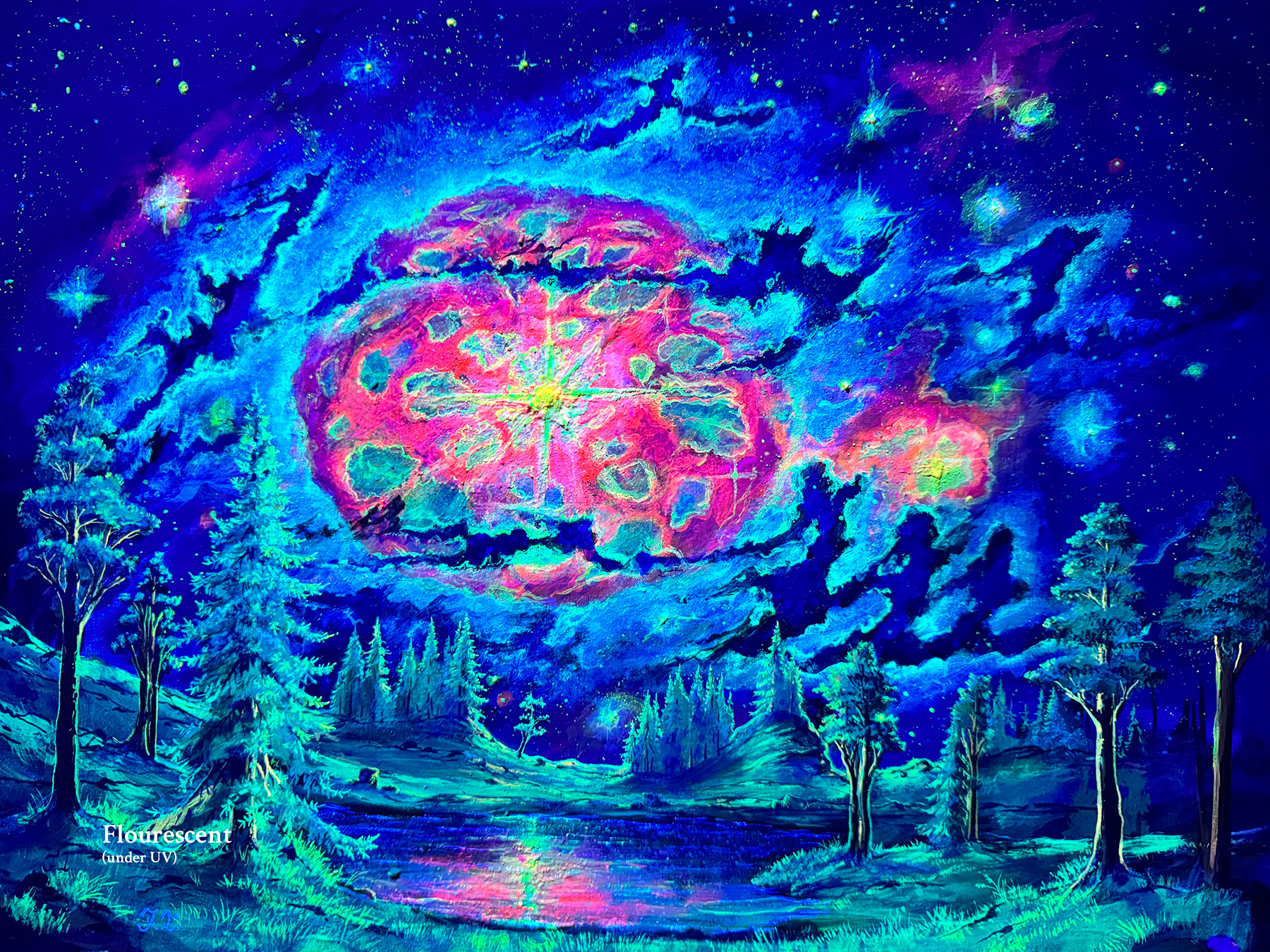 This three-stage painting is painted on high-quality art paper and comes together with a wooden frame. It is painted with fluorescent, luminescent and traditional oil paint. Besides the normal daylight version, it will softly glow in the dark after being exposed to light. This glow is subtle and will fade over time as the pigments release their stored energy - until it gets charged again. Exposing the painting to a UV blacklight will make it glow extra bright and vivid. All works are finished with a UV-protective varnish to enhance their longevity, but minimizing direct sunlight exposure is recommended.