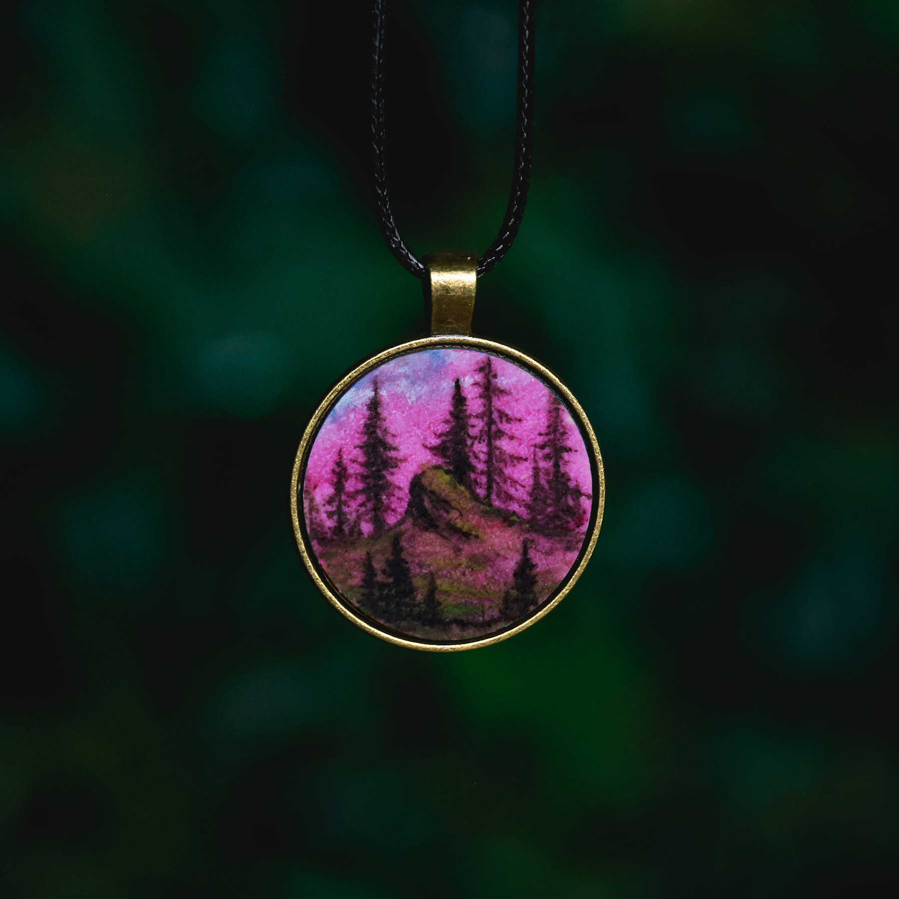 This pendant holds a hand-painted landscape painted on a solid wooden base. It is created with both fluorescent and luminescent oil paints, giving it an extra special effect. The painting will softly glow in the dark after being exposed to light and also react to an UV blacklight, making it glow extra bright and vivid. Each piece is a one-of-a-kind miniature painting and sealed with varnish for lasting protection.