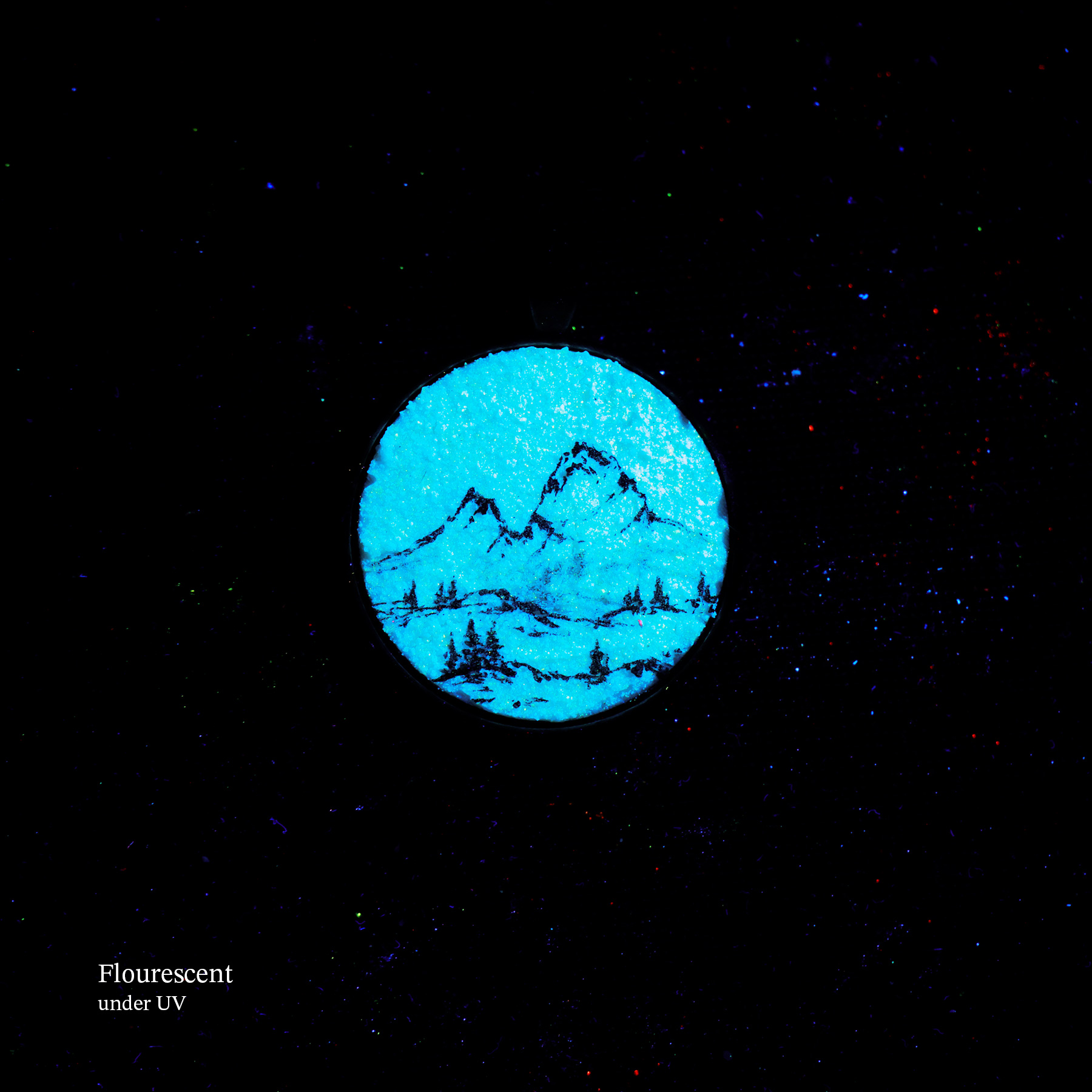 This pendant holds a hand-painted landscape painted on a solid wooden base. It is created with both fluorescent and luminescent oil paints, giving it an extra special effect. The painting will softly glow in the dark after being exposed to light and also react to an UV blacklight, making it glow extra bright and vivid. Each piece is a one-of-a-kind miniature painting and sealed with varnish for lasting protection.