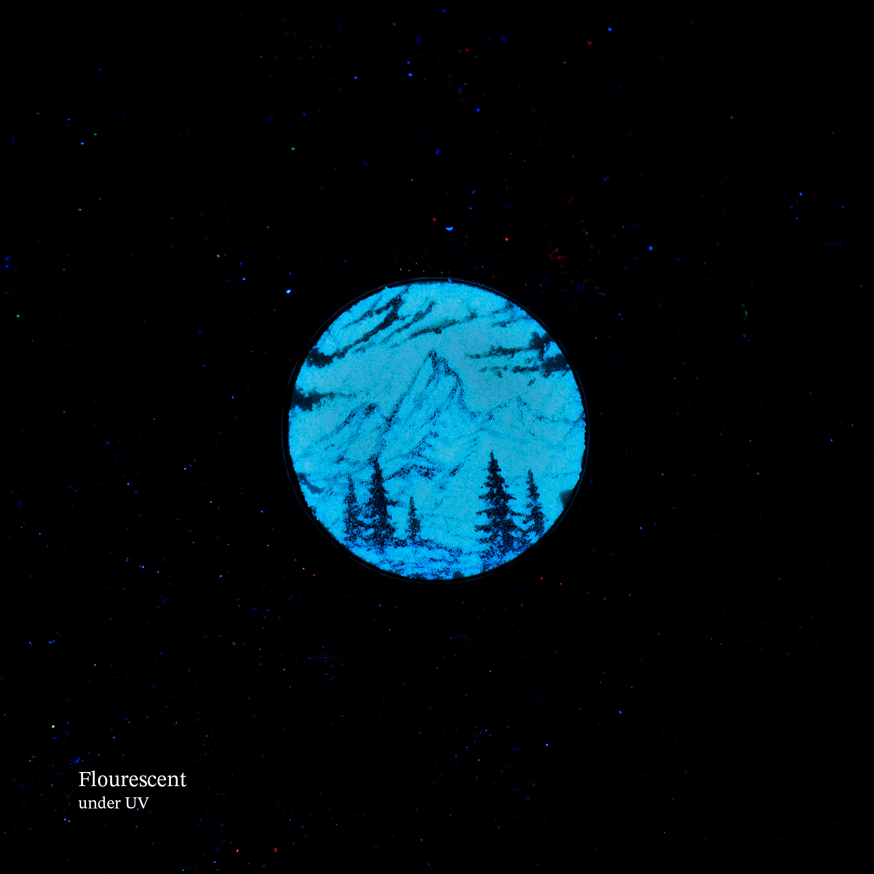 This pendant holds a hand-painted landscape painted on a solid wooden base. It is created with both fluorescent and luminescent oil paints, giving it an extra special effect. The painting will softly glow in the dark after being exposed to light and also react to an UV blacklight, making it glow extra bright and vivid. Each piece is a one-of-a-kind miniature painting and sealed with varnish for lasting protection.
