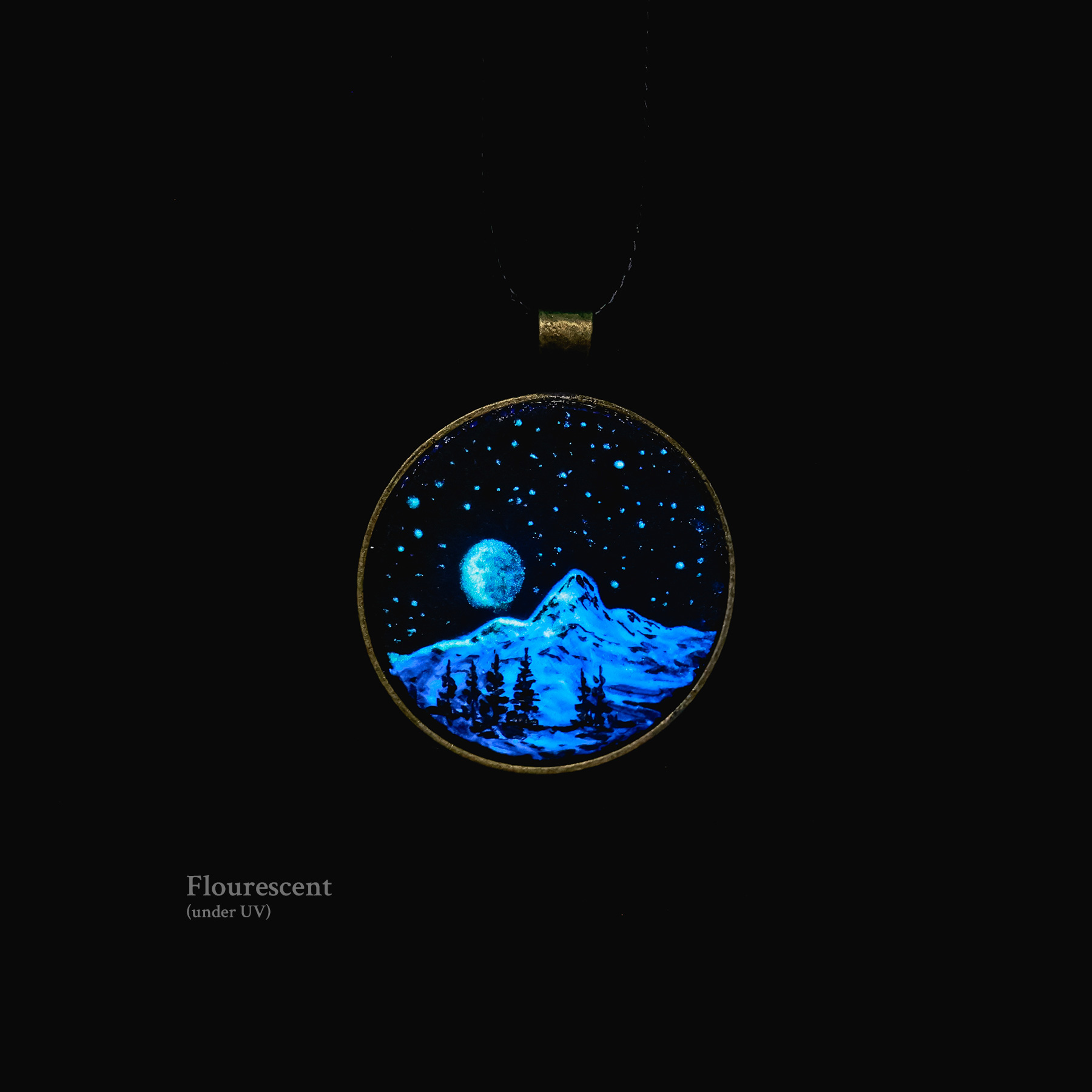 This pendant holds a hand-painted landscape painted on a solid wooden base. It is created with both fluorescent and luminescent oil paints, giving it an extra special effect. The painting will softly glow in the dark after being exposed to light and also react to an UV blacklight, making it glow extra bright and vivid. Each piece is a one-of-a-kind miniature painting and sealed with varnish for lasting protection.