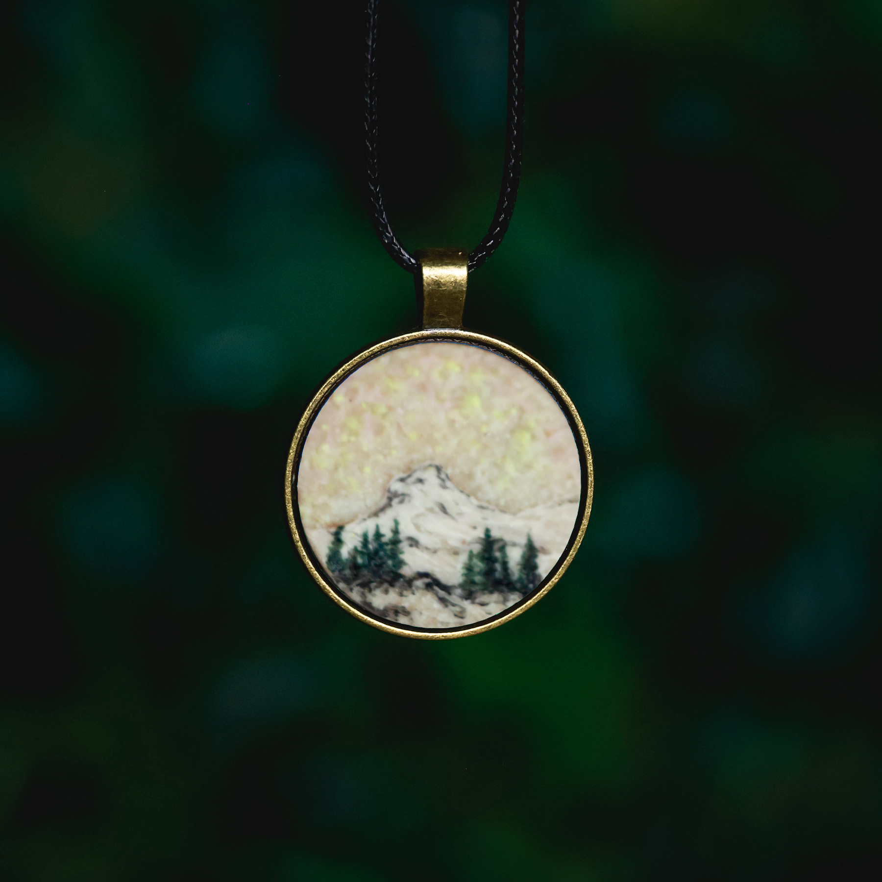 This pendant holds a hand-painted landscape painted on a solid wooden base. It is created with both fluorescent and luminescent oil paints, giving it an extra special effect. The painting will softly glow in the dark after being exposed to light and also react to an UV blacklight, making it glow extra bright and vivid. Each piece is a one-of-a-kind miniature painting and sealed with varnish for lasting protection.