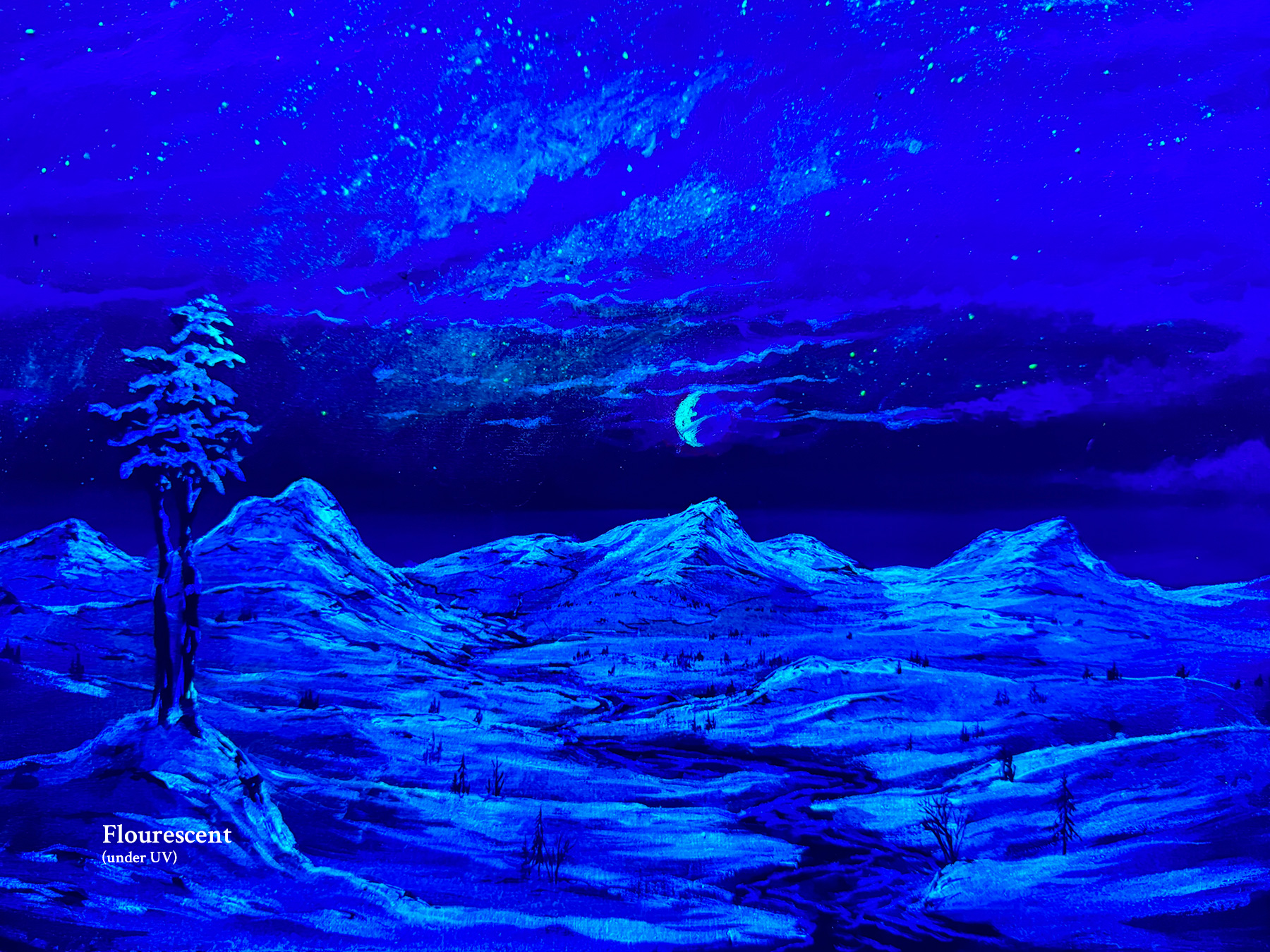 This three-stage painting is painted on high-quality art paper and comes together with a wooden frame. It is painted with fluorescent, luminescent and traditional oil paint. Besides the normal daylight version, it will softly glow in the dark after being exposed to light. This glow is subtle and will fade over time as the pigments release their stored energy - until it gets charged again. Exposing the painting to a UV blacklight will make it glow extra bright and vivid. All works are finished with a UV-protective varnish to enhance their longevity, but minimizing direct sunlight exposure is recommended.