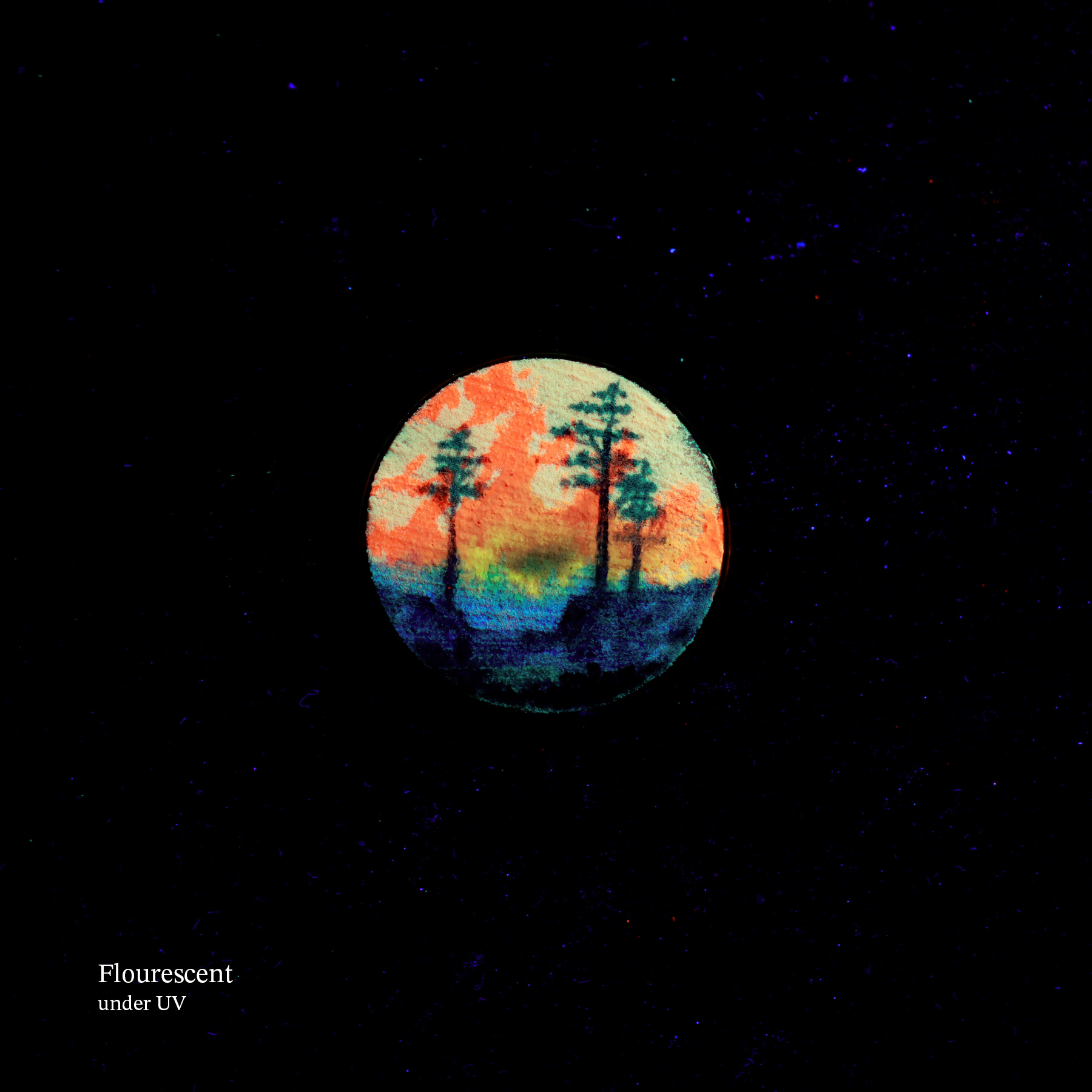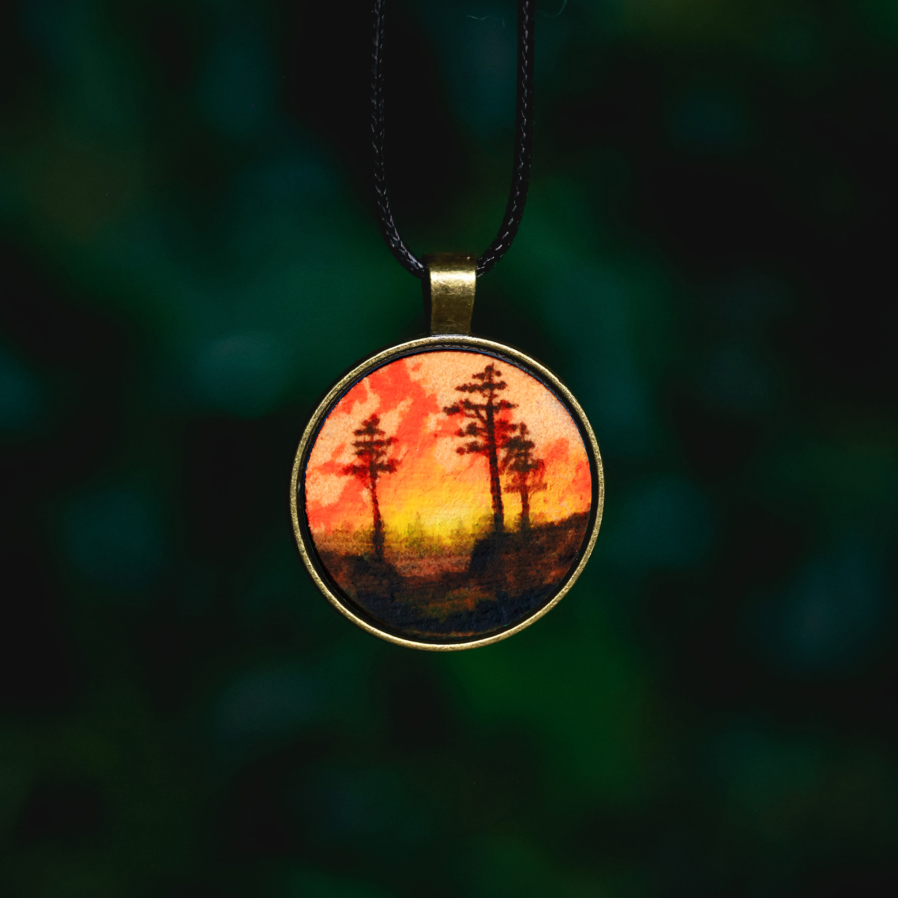 This pendant holds a hand-painted landscape painted on a solid wooden base. It is created with both fluorescent and luminescent oil paints, giving it an extra special effect. The painting will softly glow in the dark after being exposed to light and also react to an UV blacklight, making it glow extra bright and vivid. Each piece is a one-of-a-kind miniature painting and sealed with varnish for lasting protection.
