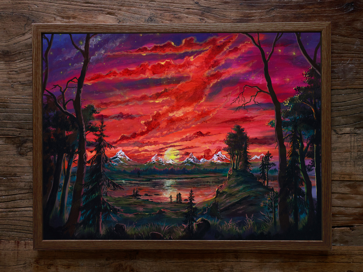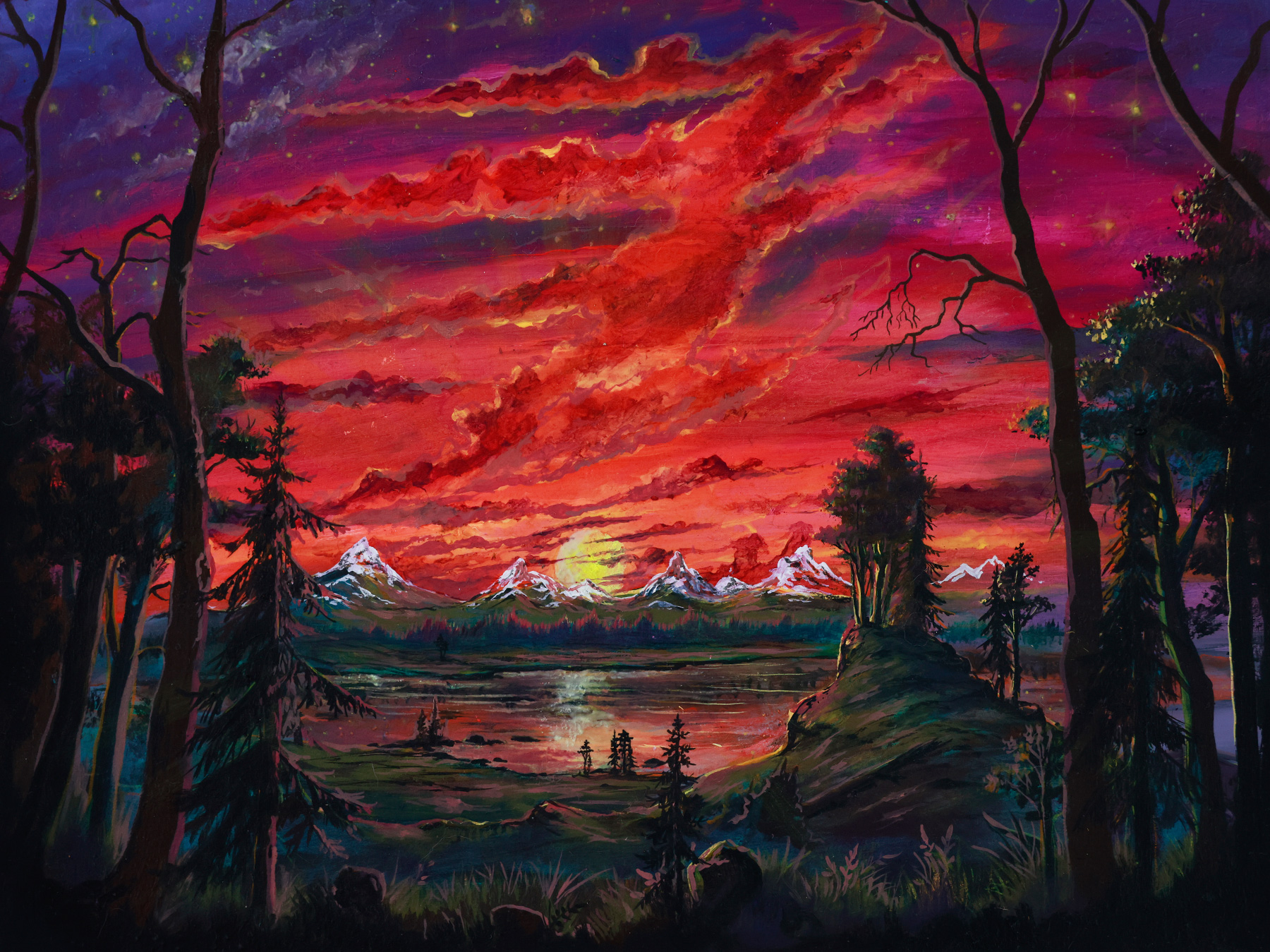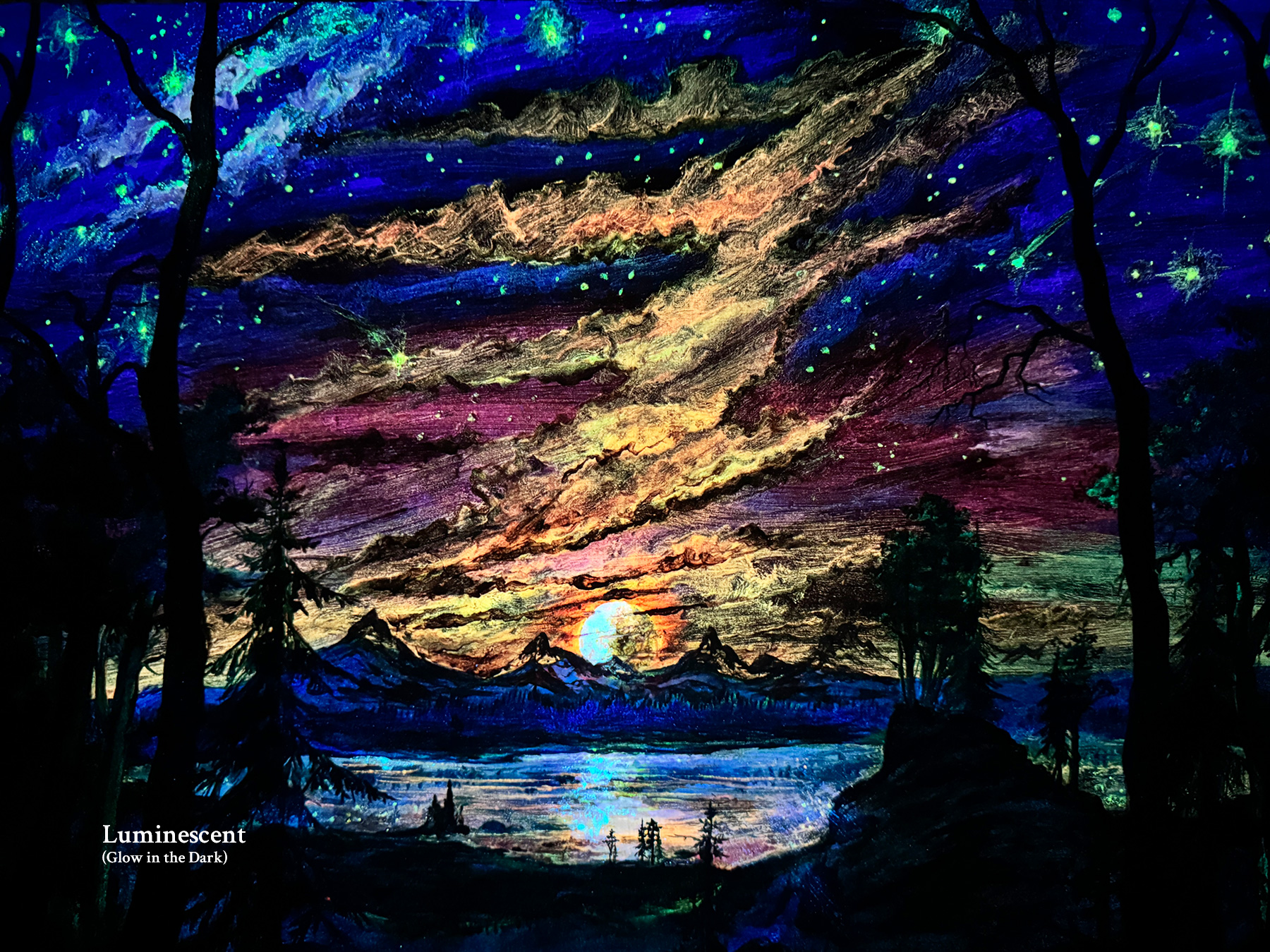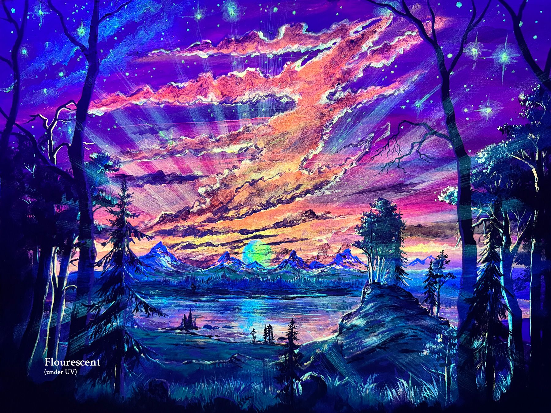 This three-stage painting is painted on high-quality art paper and comes together with a wooden frame. It is painted with fluorescent, luminescent and traditional oil paint. Besides the normal daylight version, it will softly glow in the dark after being exposed to light. This glow is subtle and will fade over time as the pigments release their stored energy - until it gets charged again. Exposing the painting to a UV blacklight will make it glow extra bright and vivid. All works are finished with a UV-protective varnish to enhance their longevity, but minimizing direct sunlight exposure is recommended.