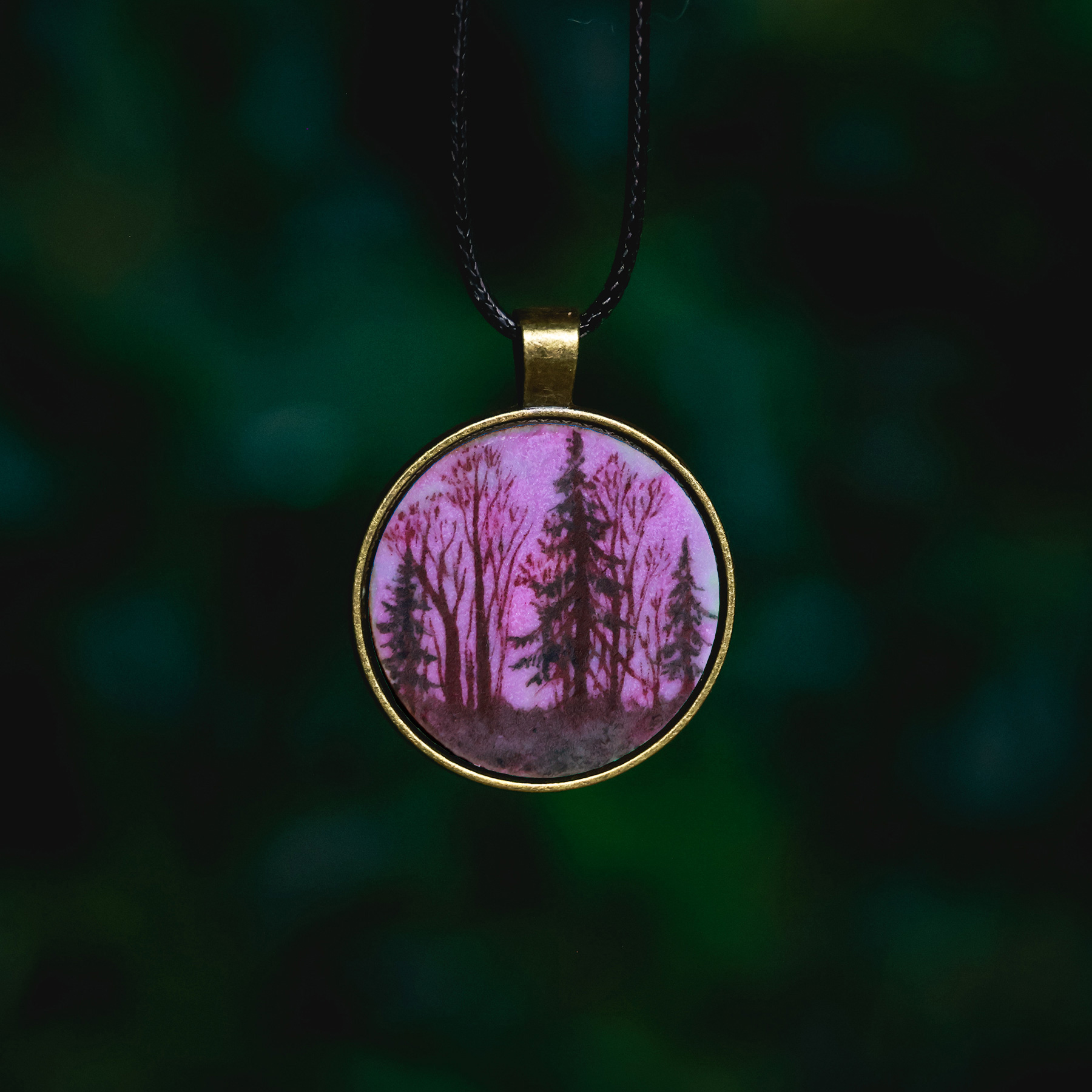 This pendant holds a hand-painted landscape painted on a solid wooden base. It is created with both fluorescent and luminescent oil paints, giving it an extra special effect. The painting will softly glow in the dark after being exposed to light and also react to an UV blacklight, making it glow extra bright and vivid. Each piece is a one-of-a-kind miniature painting and sealed with varnish for lasting protection.